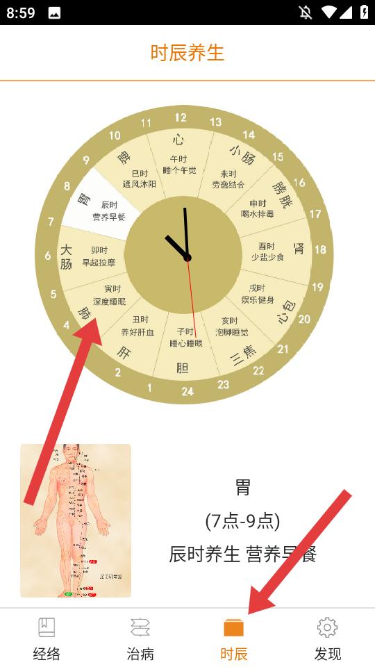 4、在時(shí)辰板塊,能看到時(shí)辰養(yǎng)生輪盤,了解不同時(shí)辰對(duì)應(yīng)的養(yǎng)生要點(diǎn),像辰時(shí)對(duì)應(yīng)胃經(jīng),要注重營(yíng)養(yǎng)早餐。