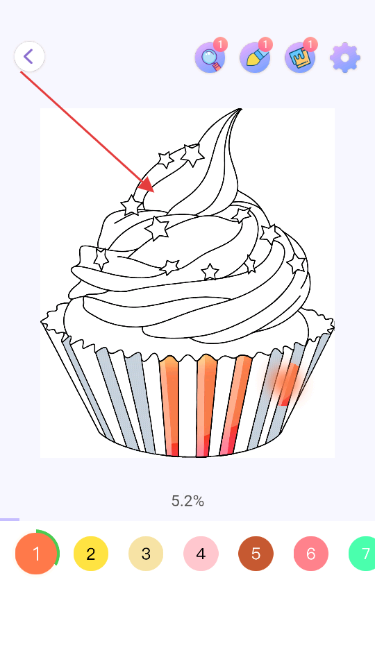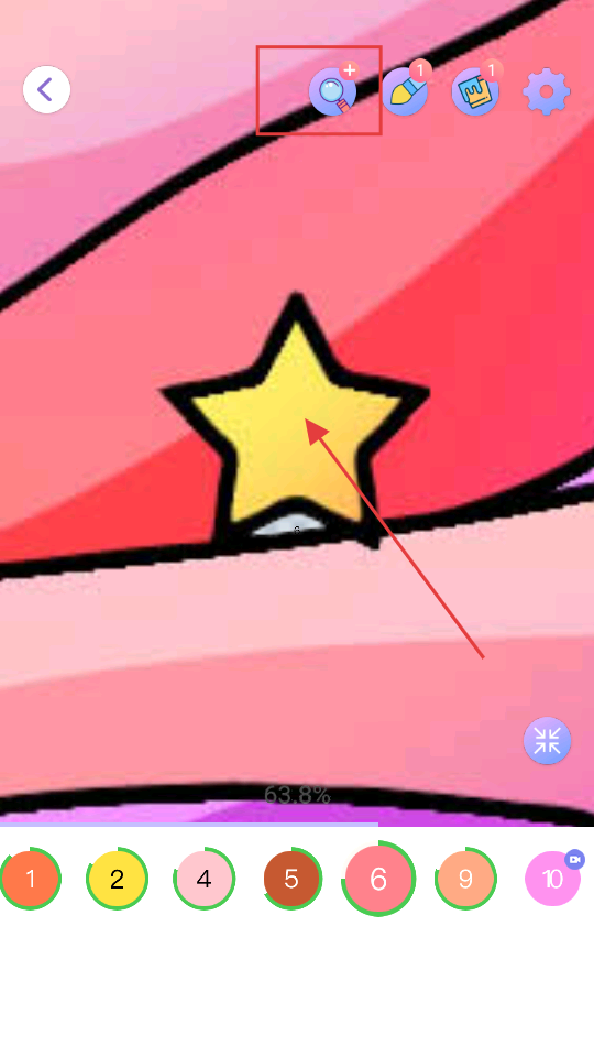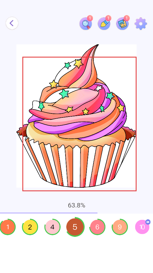 3、玩家對(duì)于圖案中一些較小或較精細(xì)的部分,如紙杯蛋糕上的星星裝飾,可以點(diǎn)擊界面上方的放大鏡圖標(biāo),放大圖案更精準(zhǔn)地進(jìn)行涂色。