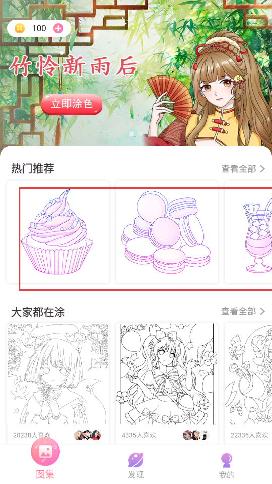 1、玩家下載游戲在游戲主界面的熱門推薦等分類中挑選喜歡的圖案,比如精美的紙杯蛋糕線稿,點(diǎn)擊進(jìn)入涂色界面。
