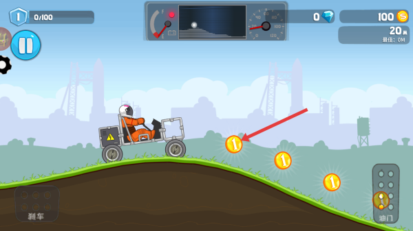 1、游戲開始,操控賽車山地行駛,賽道上有金幣,駕駛賽車去收集金幣,同時(shí)注意賽車的行駛狀態(tài)。