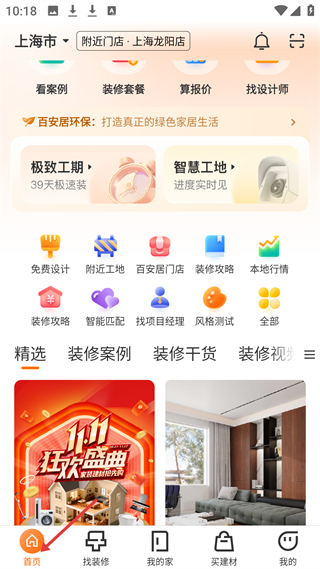 1、首頁功能入口有看案例、找設計師等,提供39天極速裝、智慧工地服務,還有免費設計、裝修攻略,可參與雙11家裝建材搶購。