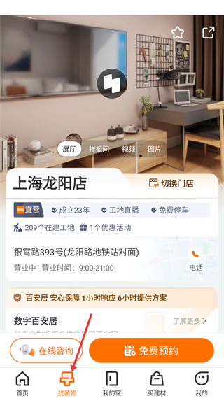 2、找裝修頁上海龍陽店成立23年,209個在建工地,可在線咨詢或免費預約,享1小時響應、6小時出方案保障。
