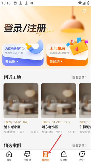 3、我的家頁可登錄注冊,有AI煥新家免費生成VR方案、上門量房服務,展示附近工地和精選案例,了解裝修實況。