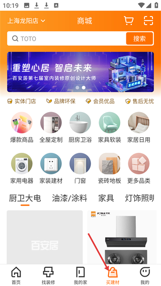 4、買建材頁功能入口有全屋定制、廚房衛(wèi)浴等,提供實體門店、品牌環(huán)保保障,可選購爆款商品、家裝建材。