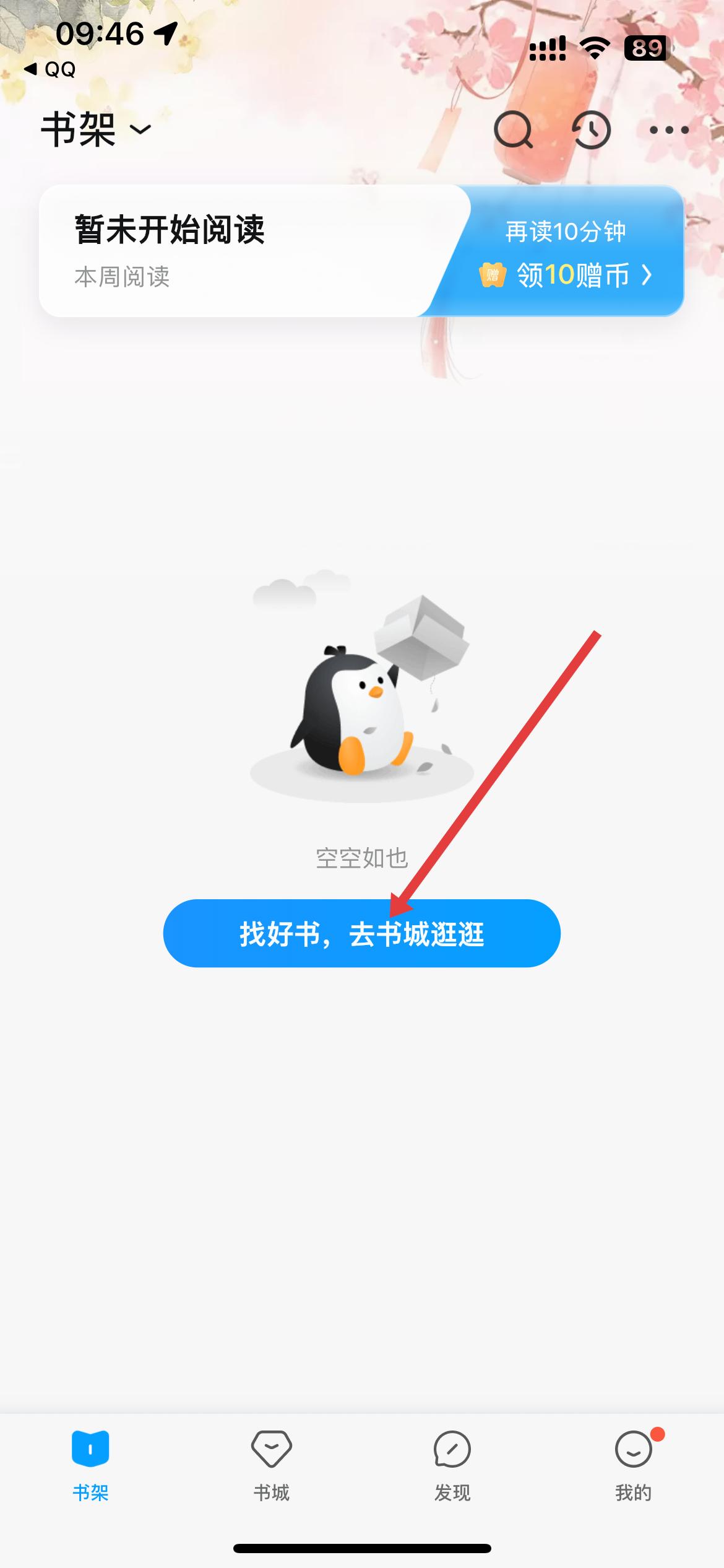 1、打開QQ閱讀,若書架空空,可點(diǎn)擊找好書,去書城逛逛,進(jìn)入書城挑選感興趣的書籍。