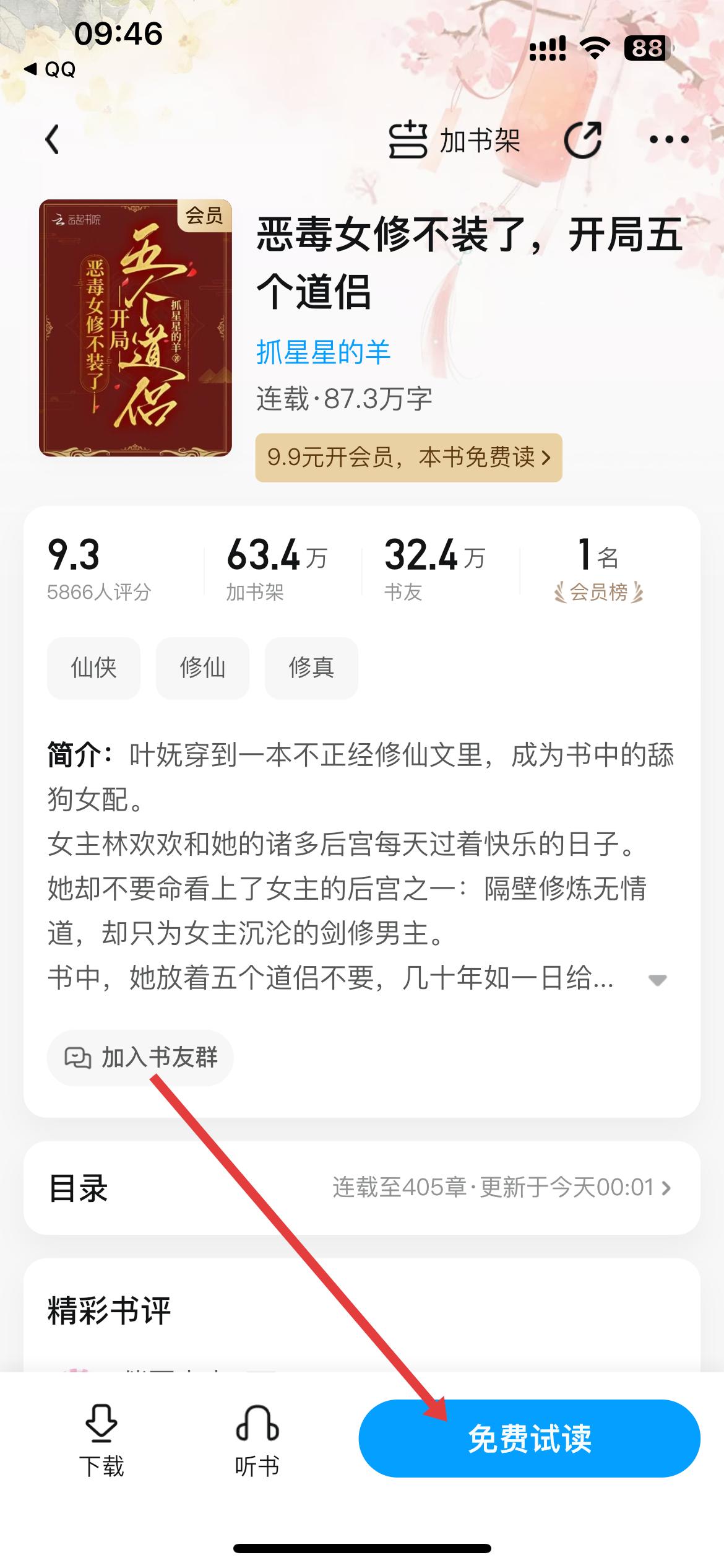 3、進(jìn)入小說詳情頁,能看到評分、簡介等信息,點(diǎn)擊免費(fèi)試讀,就能開始閱讀小說內(nèi)容。