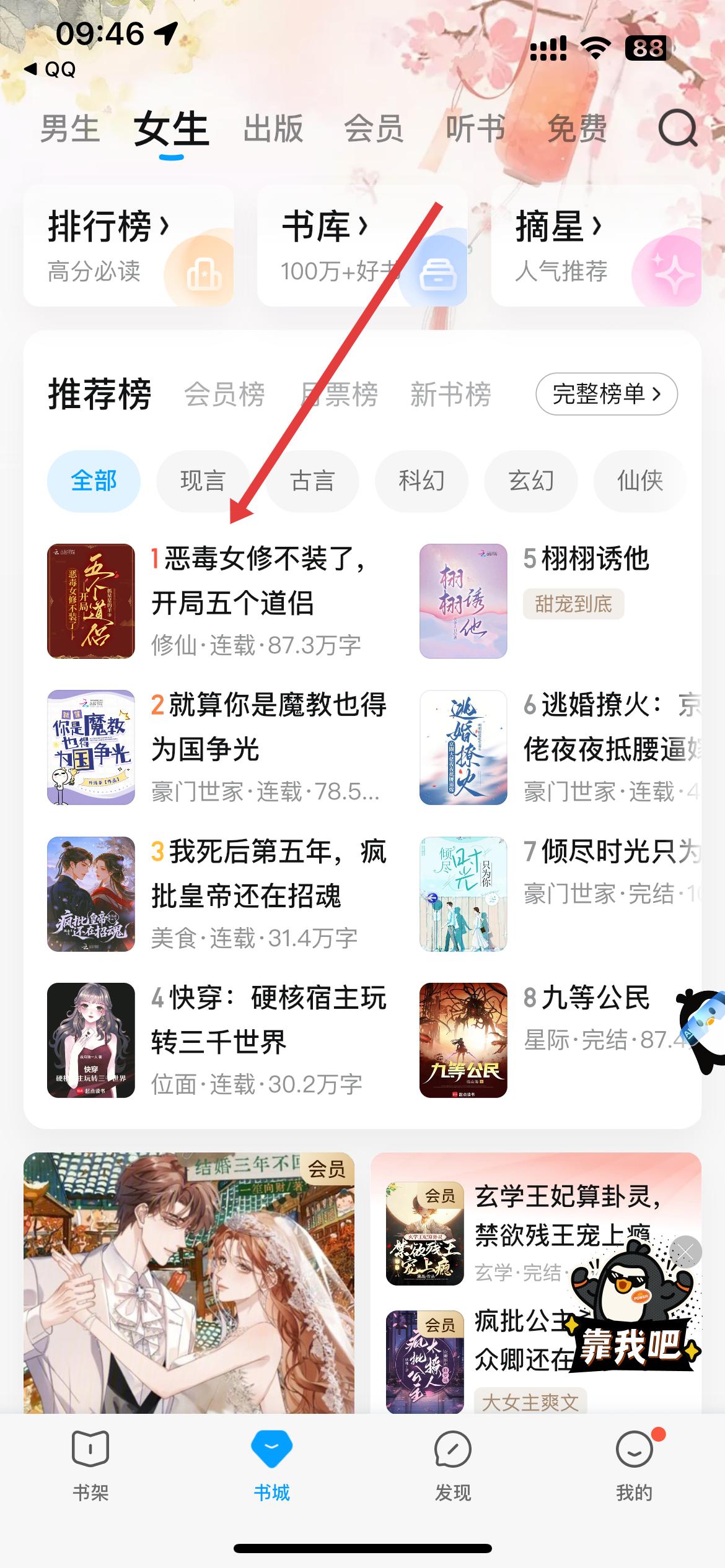 2、書城的推薦榜等板塊,能看到各類小說,比如惡毒女修不裝了,開局五個(gè)道侶,可點(diǎn)擊進(jìn)入詳情頁。