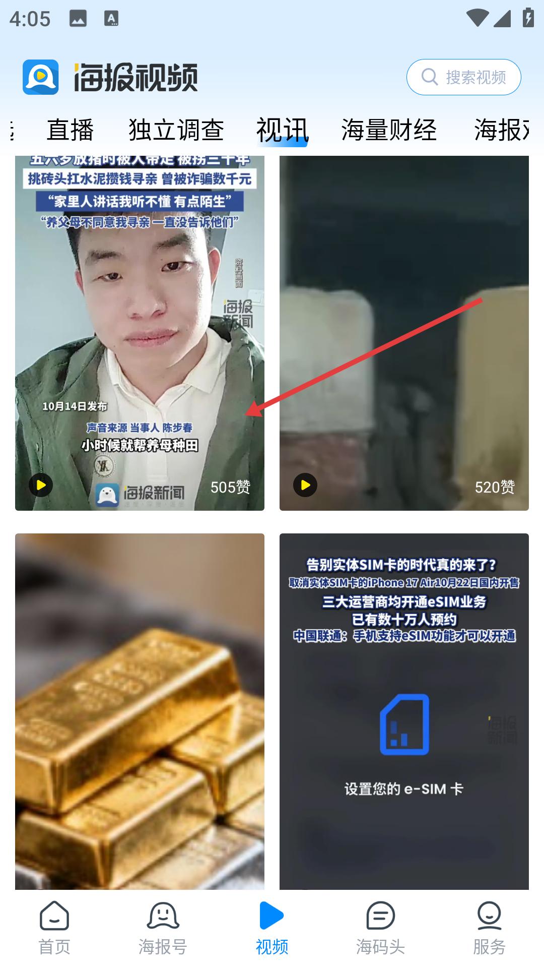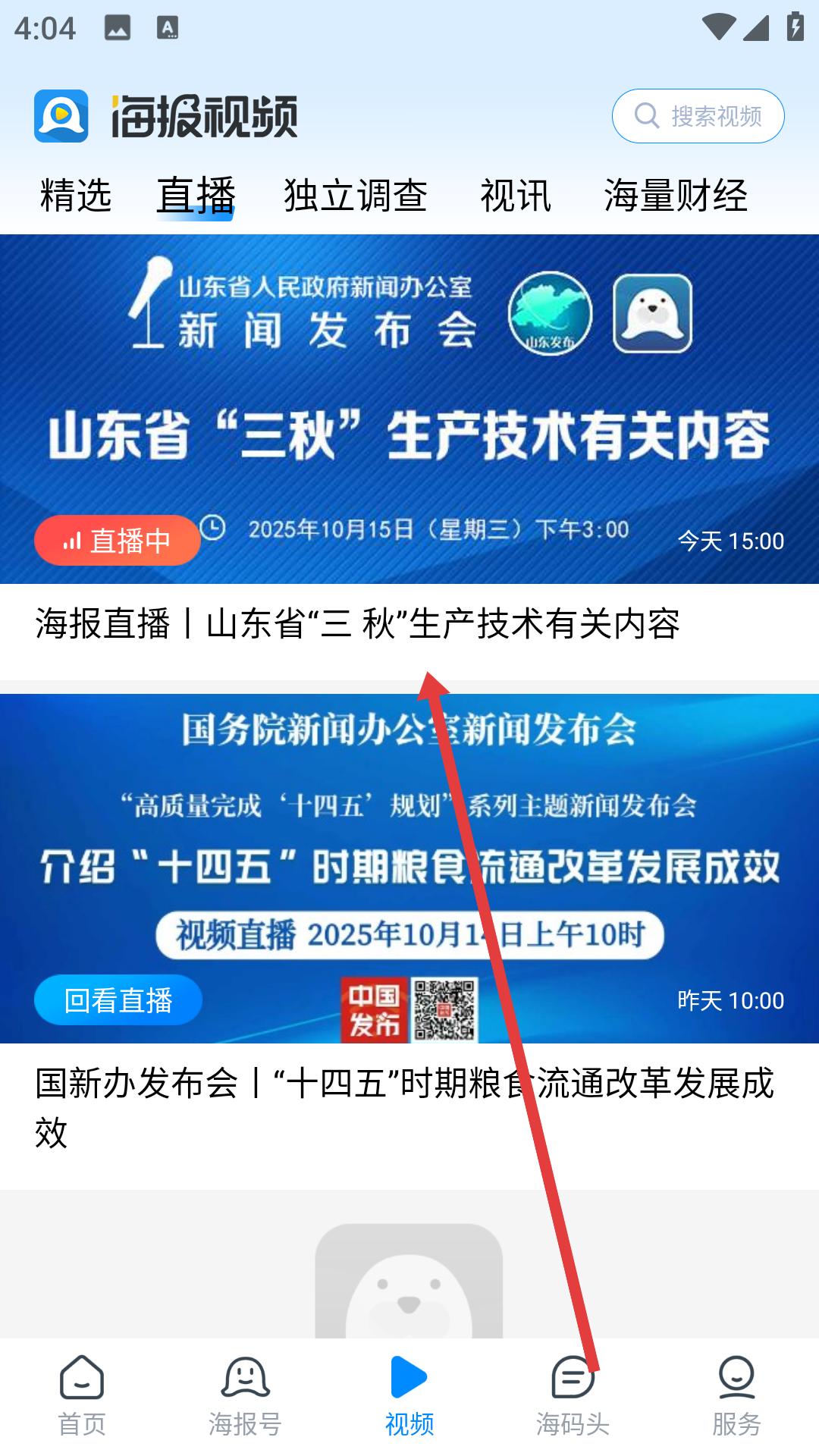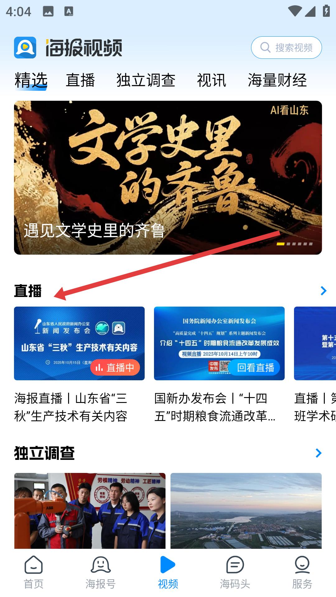 3、切換到底部視頻進入海報視頻界面,有精選、直播等分類,精選頻道有專題內容,直播板塊可看國新辦發(fā)布會等直播或回看,獨立調查頻道呈現(xiàn)深度視頻報道。
