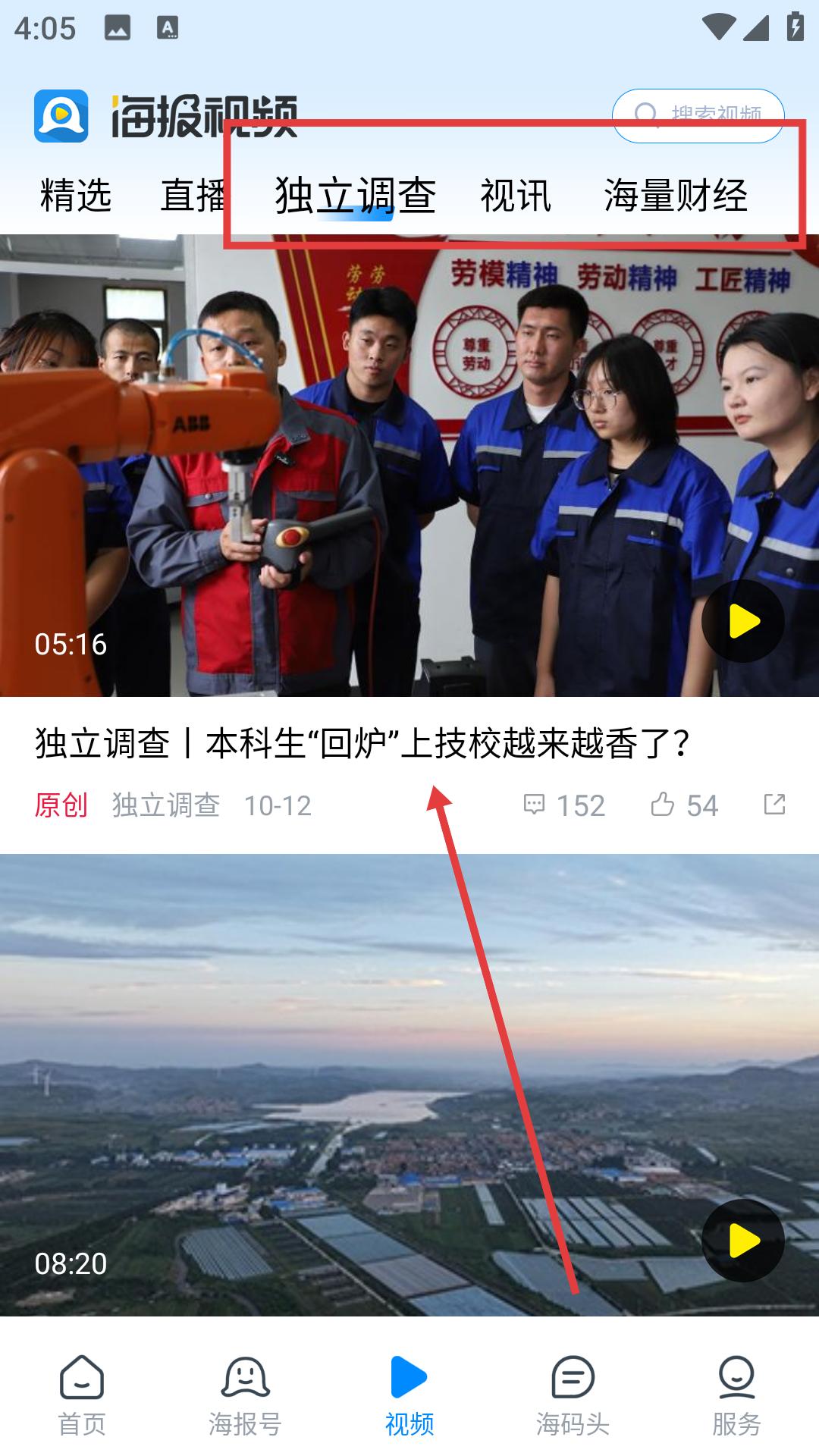 3、返回主界面點擊獨立調查板塊,進入獨立調查內容頁面,看到本科生回爐上技校越來越香了等視頻,選擇想看的視頻點擊觀看。