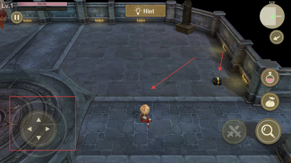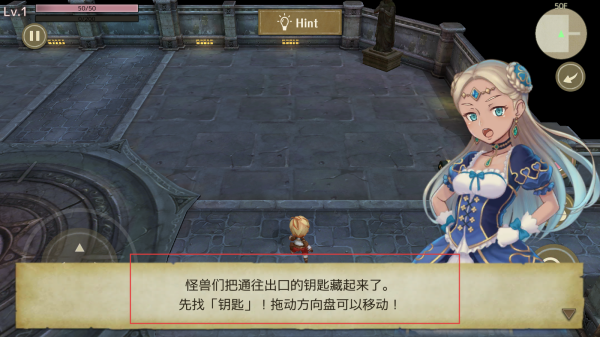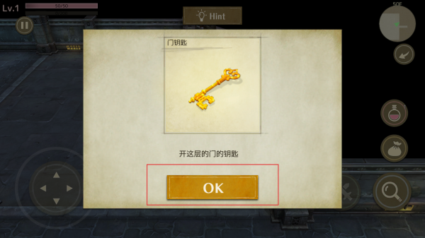 2、進入游戲后通過屏幕左下角的虛擬搖桿操控角色移動,在如地牢房間等場景中探索,尋找可以幫助逃脫的物品和線索。