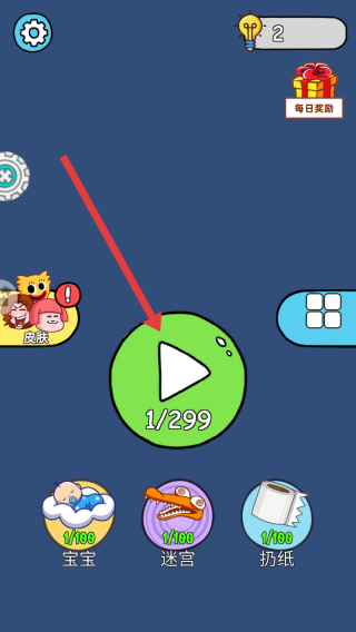 1、打開游戲,界面有每日獎勵等標識,點擊綠色開始按鈕,進入等級1的關(guān)卡準備畫線。