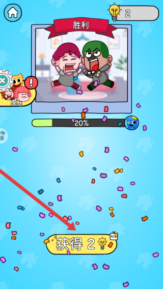 4、成功讓小人到達房子后,會出現(xiàn)勝利界面,屏幕飄灑彩紙,還能獲得2個燈泡獎勵,完成關(guān)卡挑戰(zhàn)。