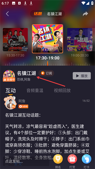 3、節(jié)目互動板塊有名鎮(zhèn)江湖直播節(jié)目,支持訂閱、互動話題參與,增強用戶與節(jié)目粘性,豐富用車生活娛樂體驗。