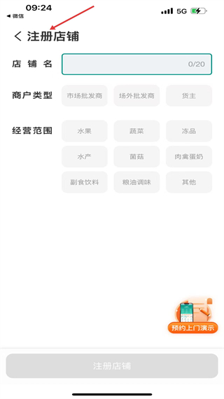 4、注冊店鋪頁需填寫店鋪名稱,選擇商戶類型如市場批發(fā)商等和經營范圍水果、蔬菜等品類,完成店鋪注冊操作。