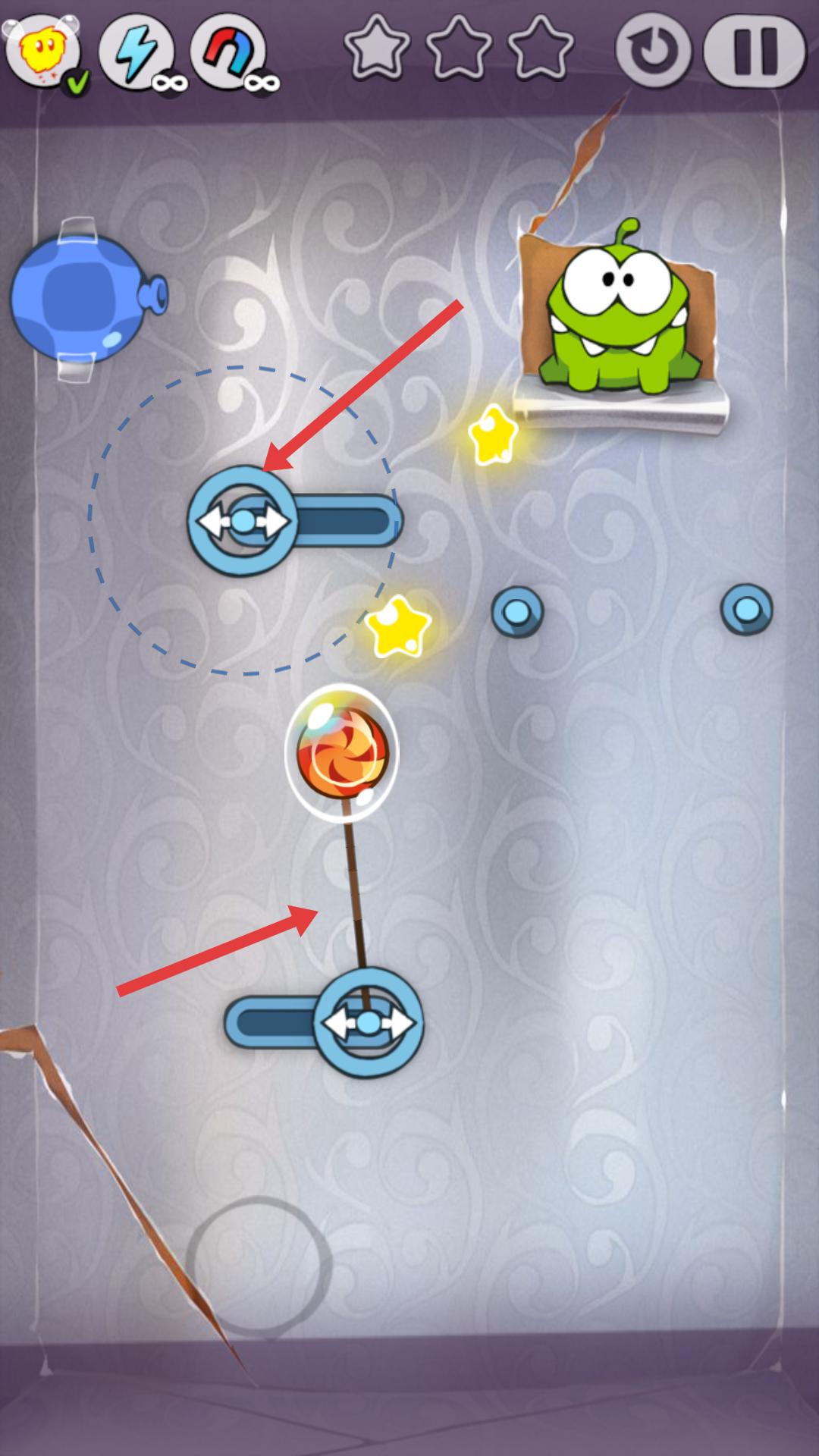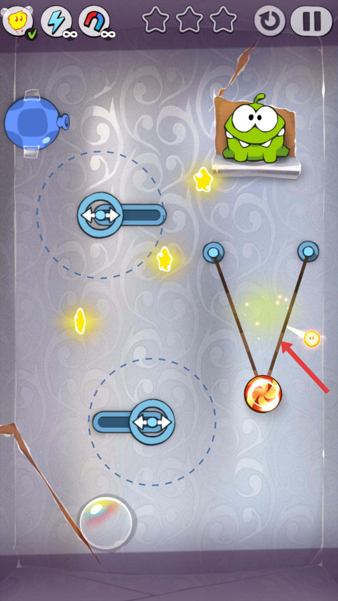 3、移動上方和下方的機(jī)關(guān),調(diào)整糖果的位置與繩子的狀態(tài),讓糖果能順利靠近小怪獸,同時(shí)盡量收集星星。