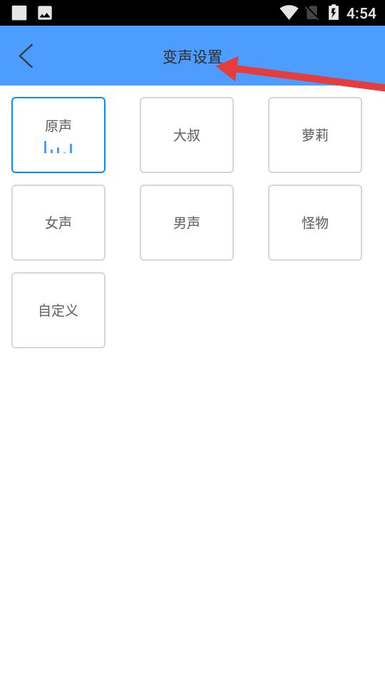 3、變聲設(shè)置頁布局簡(jiǎn)潔原聲、大叔、蘿莉等預(yù)設(shè)音效一鍵切換,女聲、男聲、怪物模式及自定義選項(xiàng)覆蓋多元需求。