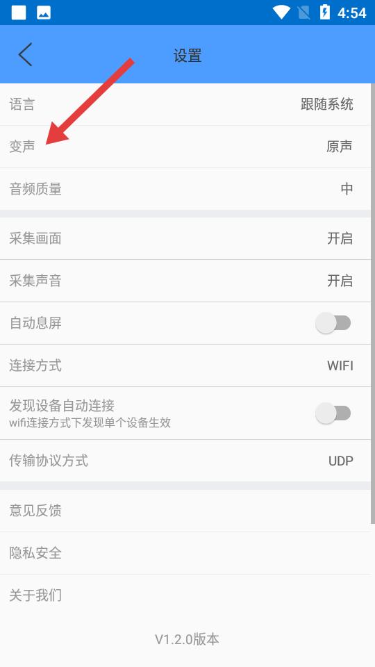 2、設(shè)置界面功能豐富變聲選項(xiàng)尤為醒目,點(diǎn)擊即可進(jìn)入專屬設(shè)置頁,與語言、音頻質(zhì)量等選項(xiàng)配合,從聲音特質(zhì)到畫面采集全面調(diào)控。