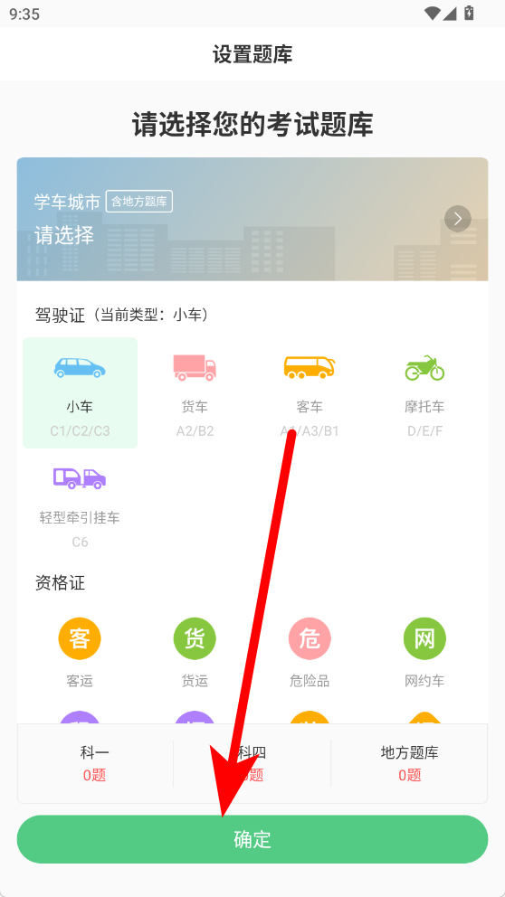 1、選學車城市、駕駛證類型和考試科目,點確定匹配題庫,開始練習。