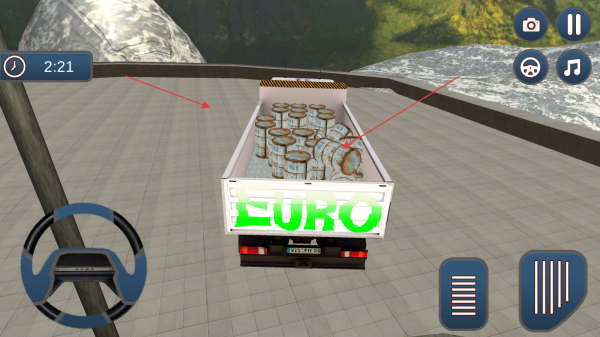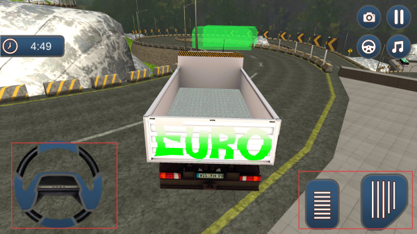 3、進(jìn)入駕駛界面利用左下角的虛擬方向盤控制卡車的行駛方向,點(diǎn)擊右下角的換擋按鈕進(jìn)行前進(jìn)或后退操作,以此在道路上行駛。