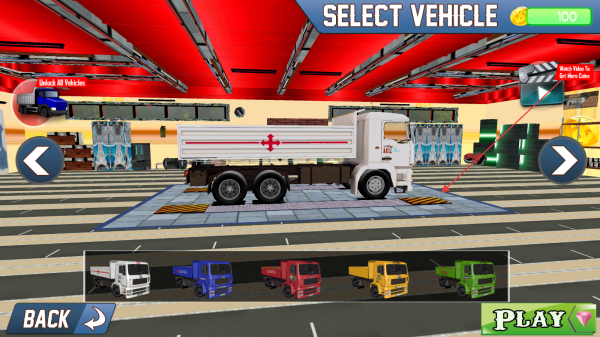 2、進(jìn)入車輛選擇界面后,通過點(diǎn)擊左右箭頭瀏覽不同的卡車,選擇你想要駕駛的卡車,然后點(diǎn)擊PLAY確認(rèn)。