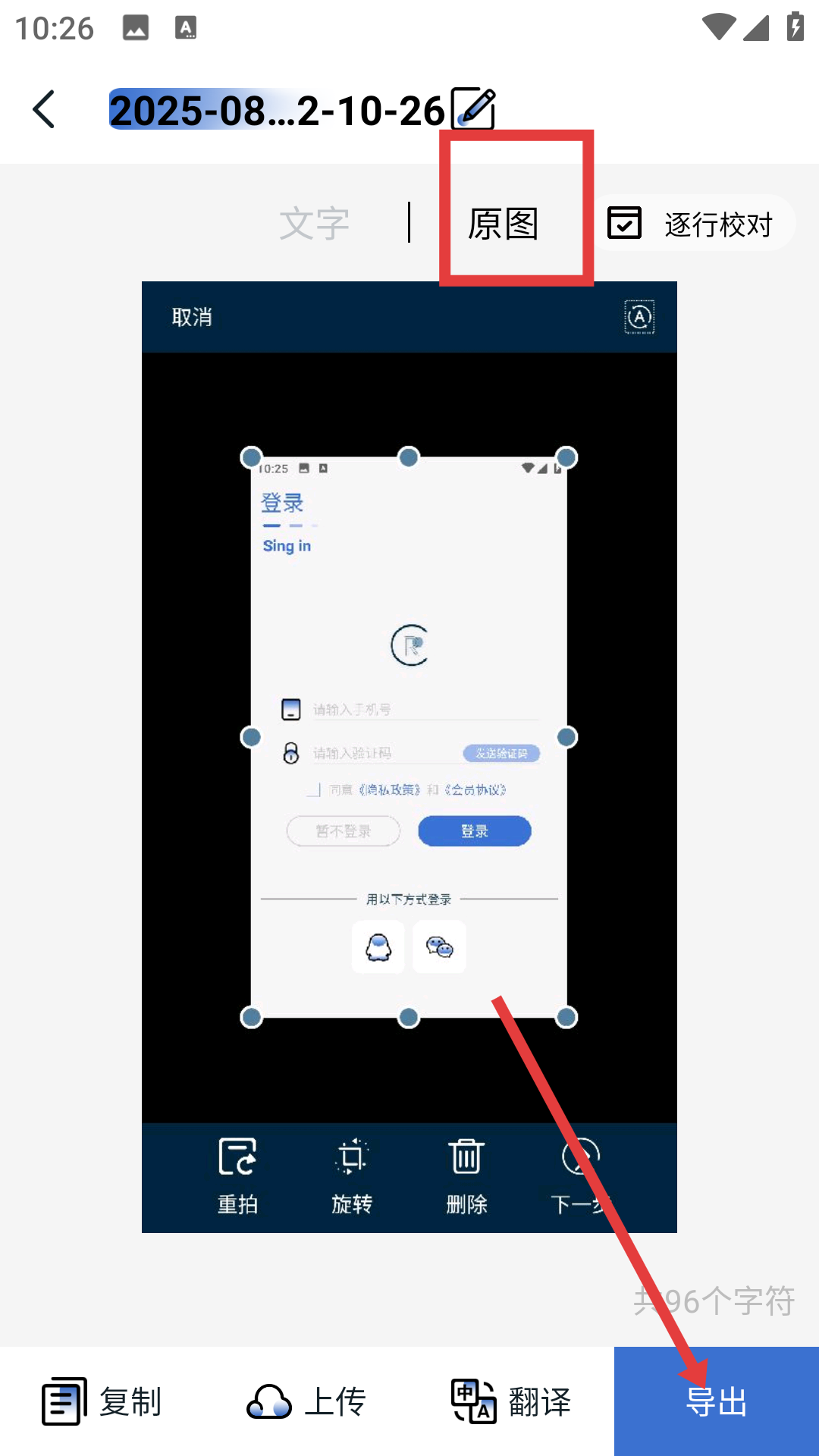 2、在新界面點擊原圖可查看原始掃描畫面,確認內(nèi)容沒問題后點擊右下角導出按鈕,開啟文件導出設置,進入可保存的文件形式選擇階段。