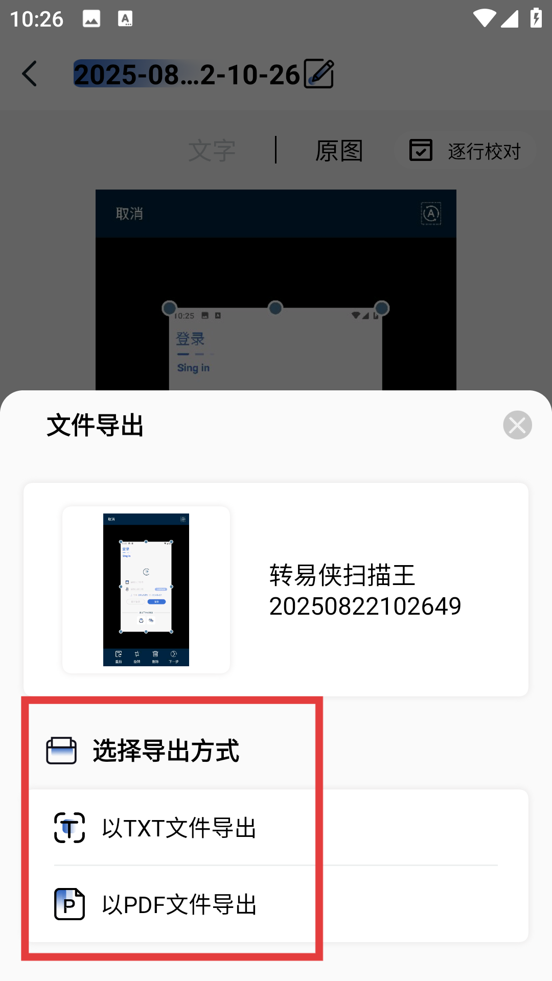 3、彈出文件導出窗口,有以TXT文件導出、以PDF文件導出等方式,按需選一種導出格式,比如選PDF就能將處理后的圖片以PDF文件保存到設備。