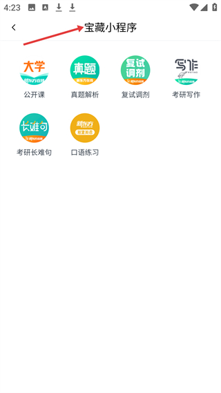 1、寶藏小程序界面,有新東方在線的公開課、真題解析、復(fù)試調(diào)劑、考研寫作、考研長(zhǎng)難句、口語練習(xí)等小程序入口。