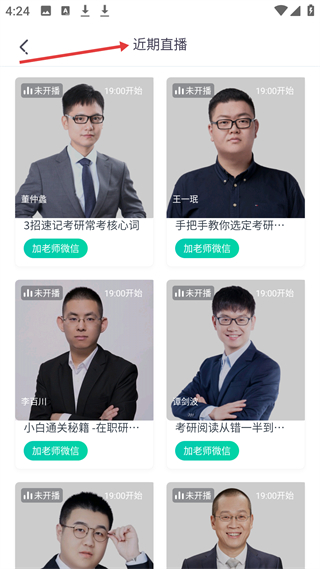 2、近期直播頁面,有董仲蠡、王一珉等老師的考研相關(guān)直播,多在19:00開始,可加老師微信助力考研學(xué)習(xí)。