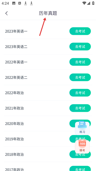 3、歷年真題頁面列出2017、2023年英語一、英語二及政治等科目的真題,每類真題旁有去考試按鈕方便刷題。