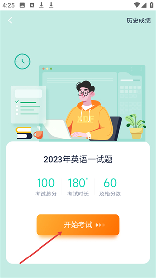 4、2023年英語一試題界面,總分100,時(shí)長(zhǎng)180分鐘,及格分60,有開始考試按鈕還可查看歷史成績(jī)。