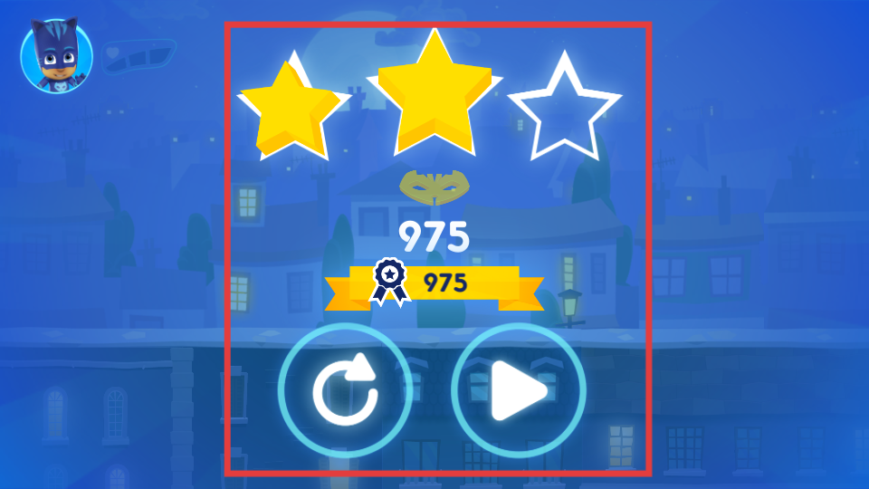 4、通關(guān)后會顯示星級和分?jǐn)?shù),星級越高、分?jǐn)?shù)越多越好,若對成績不滿意,可點擊重新開始按鈕再挑戰(zhàn),想繼續(xù)下一關(guān)就點播放按鈕。