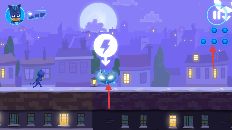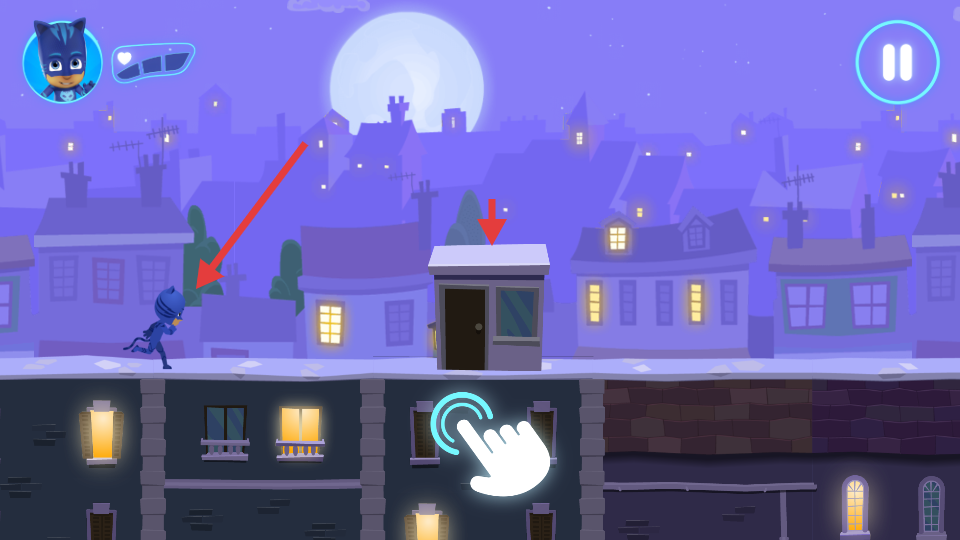 2、進(jìn)入游戲場景中,角色需在屋頂移動,遇到小屋子等障礙時,按提示點擊屏幕,操控角色跳躍等動作來通過。