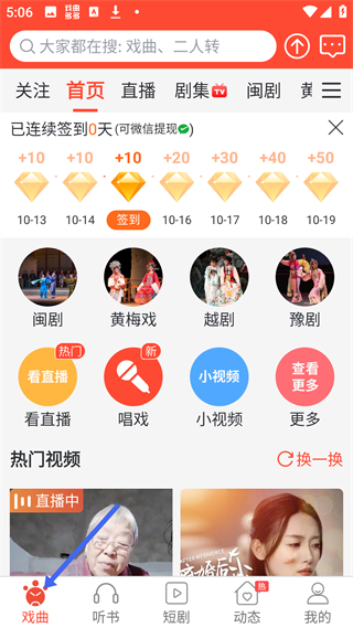 1、戲曲頁面有搜索欄可關(guān)注、看直播、找劇集等,還能簽到領(lǐng)鉆石,有閩劇、黃梅戲等戲曲分類,以及看直播、唱戲等功能,展示熱門視頻。