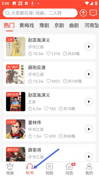 2、聽書頁面有熱門、黃梅戲等分類展示趙匡胤演義、薛剛反唐等評(píng)書,標(biāo)注上新、熱門飆升等標(biāo)簽,方便用戶選擇收聽。