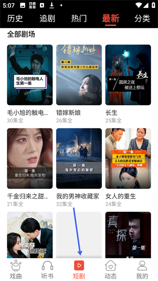 3、短劇頁面有歷史、追劇等分類,展示毛小旭的觸電人生、錯(cuò)嫁新娘等最新短劇,每部劇有集數(shù)標(biāo)注可供用戶觀看。