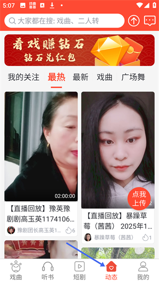 4、動(dòng)態(tài)頁面有看戲賺鉆石活動(dòng),分我的關(guān)注、最熱等板塊,展示豫劇等直播回放,還有點(diǎn)我上傳按鈕,方便用戶分享內(nèi)容。