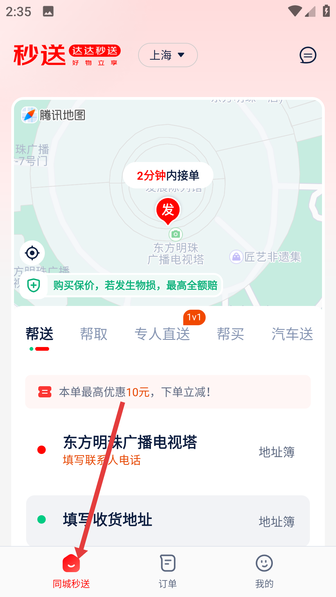 1、打開(kāi)達(dá)達(dá)快送APP默認(rèn)進(jìn)入同城秒送頁(yè)面,這里接入騰訊地圖,清晰顯示下單地點(diǎn),有幫送、幫取等服務(wù)分類(lèi),輸入收發(fā)地址、聯(lián)系人電話就能下單。