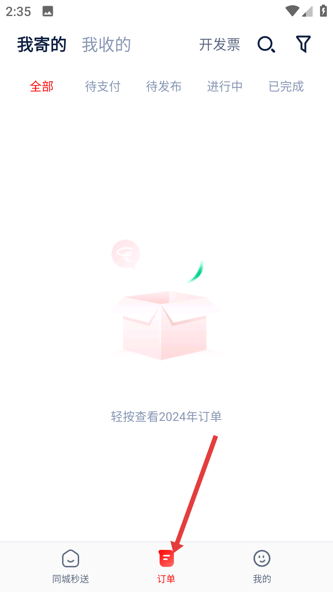 2、點(diǎn)擊底部訂單進(jìn)入訂單管理頁(yè),可切換我寄的、我收的,按待支付、進(jìn)行中等狀態(tài)篩選,直觀查看訂單進(jìn)度,還能輕按查看歷史訂單,便于跟蹤配送、管理收支。