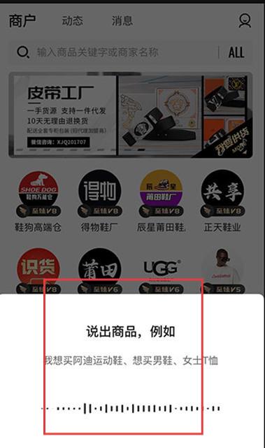 1、購物APP語音搜索界面,可說出商品需如阿迪運(yùn)動(dòng)鞋,輔助快速找商品。