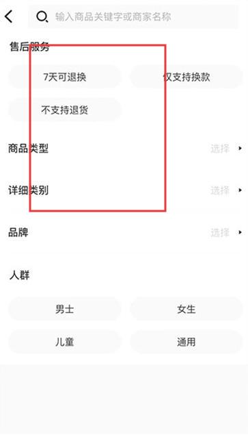 2、商品篩選界面,可按售后服務(wù)7天退換等、類型、品牌等條件精準(zhǔn)找貨。