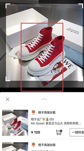 3、商品詳情界面,展示紅色高幫帆布鞋,含價(jià)格、商家,可轉(zhuǎn)發(fā)、加購。