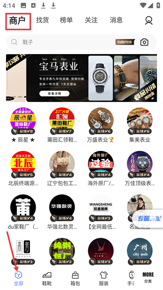 1、商戶頁面有搜索欄可搜索鞋子等,展示寶馬表業(yè)等商戶,涵蓋鞋類、箱包、手表等品類,有全部等分類入口。