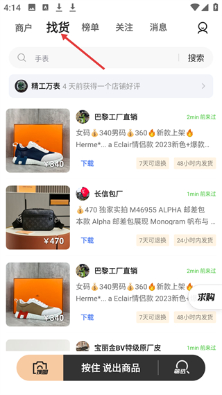 2、找貨頁面搜索欄可搜手表,展示巴黎工廠直銷等商戶的鞋子、包包等商品,標(biāo)注價(jià)格、發(fā)貨及退換貨信息。