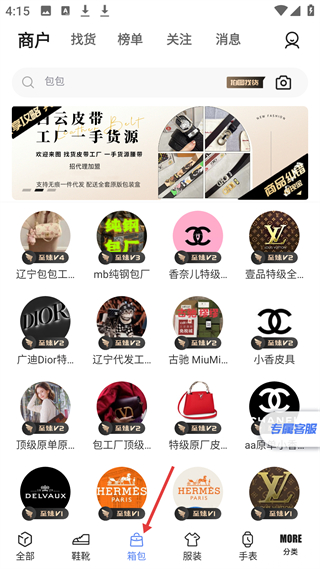 3、商戶頁面的箱包分類,有搜索欄,展示遼寧包包工廠、香奈兒特級(jí)等箱包類商戶,還有皮帶工廠貨源廣告。