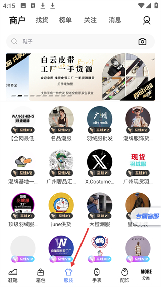 4、商戶頁面的服裝分類,搜索欄可搜鞋子,展示名品潮服、羽絨服批發(fā)等服裝類商戶,以及皮帶工廠貨源廣告。