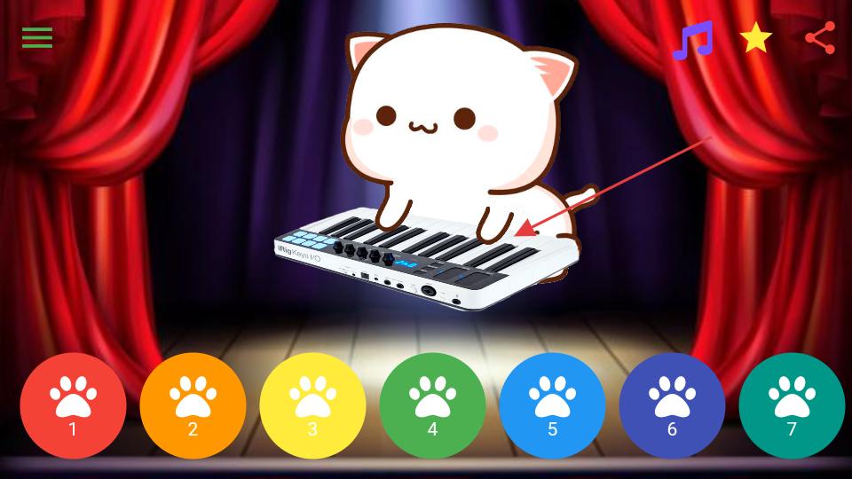 2、在演奏過程中觀察貓咪的動作,感受樂器發(fā)出的聲音,根據(jù)喜好點擊不同的爪印按鈕,切換演奏的音符或節(jié)奏。