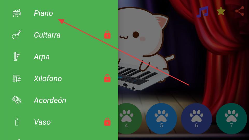 3、點擊左側菜單按鈕彈出樂器選擇列表,從中選擇喜歡的樂器,如鋼琴等,更換貓咪演奏的樂器,體驗不同樂器的音色。