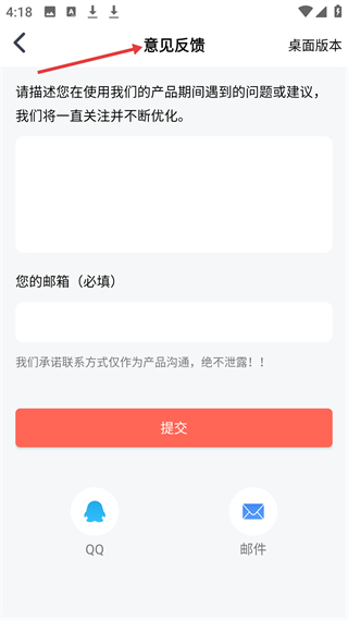 4、意見反饋頁面,可描述產(chǎn)品使用的問題或建議,填寫必填郵箱后提交,也能通過QQ、郵件反饋,助力產(chǎn)品優(yōu)化。