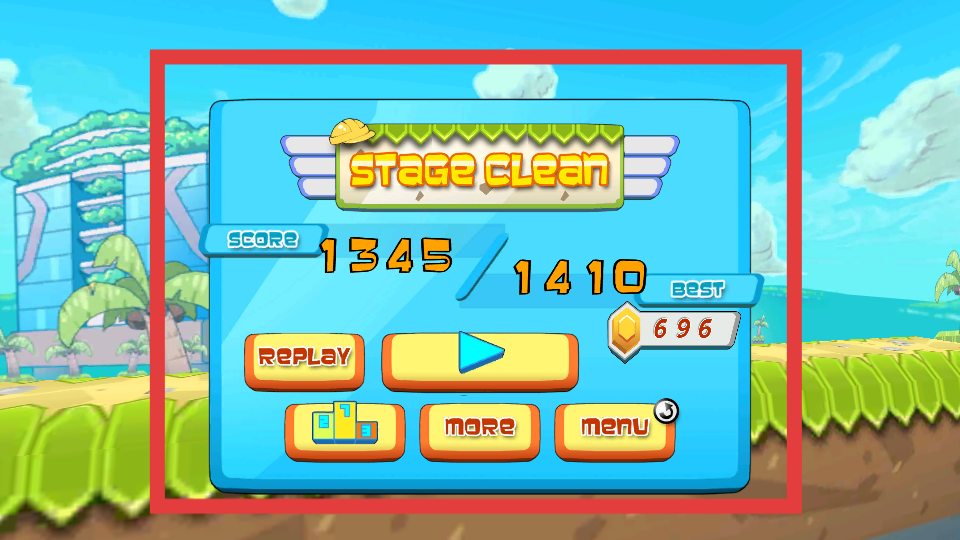 4、成功完成關(guān)卡后,會(huì)顯示STAGE CLEAN,可查看分?jǐn)?shù)和獲得的道具,選擇重玩、進(jìn)入下一關(guān)等操作。