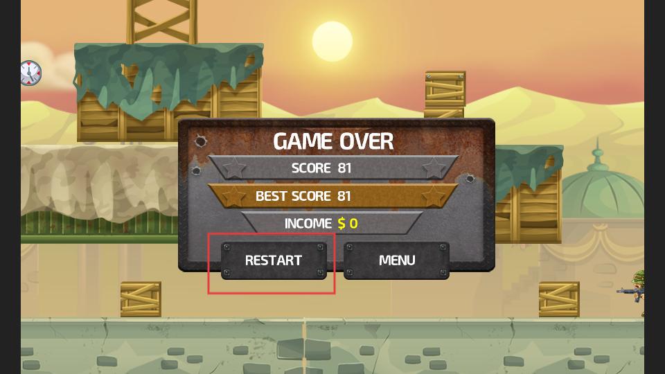 3、若游戲失敗,會出現(xiàn)GAME OVER界面,此時點(diǎn)擊RESTART按鈕就能重新開始游戲,再次挑戰(zhàn)獲取更高分?jǐn)?shù)。